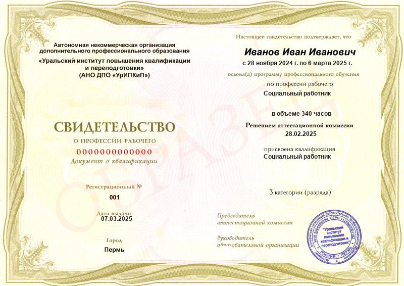 Заполненные образцы выдаваемых документов есть в описании учебных курсов и на странице «Лицензия. Документы», а также на главной странице официального сайта АНО ДПО «УрИПКиП».