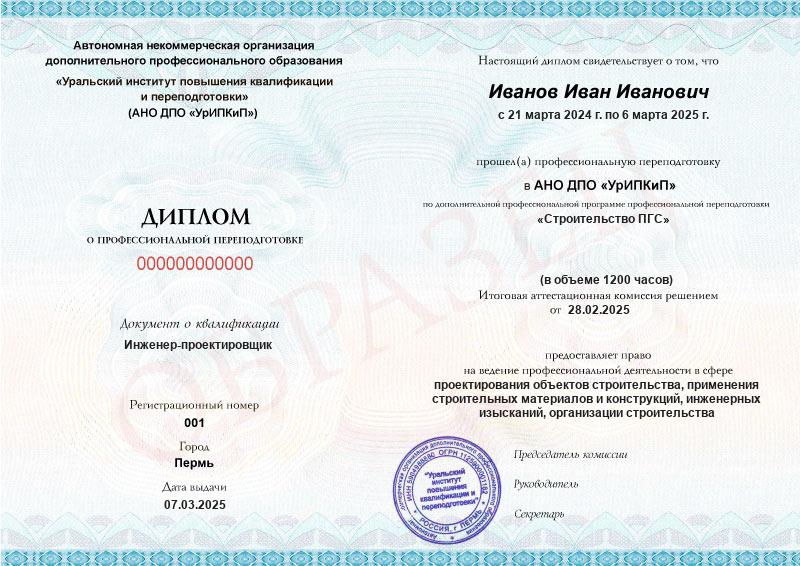 Да, дипломы и удостоверения оформляются в соответствии с действующим законодательством РФ. Документы печатаются на специальных бланках, заверяются печатью АНО ДПО «УрИПКиП».