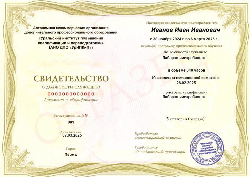 • Свидетельство о профессии рабочего с присвоением квалификации «Лаборант-микробиолог»