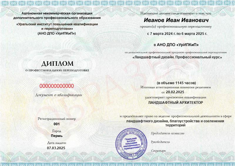 • Московский диплом о профессиональной переподготовке установленного образца с присвоением квалификации «Ландшафтный архитектор».