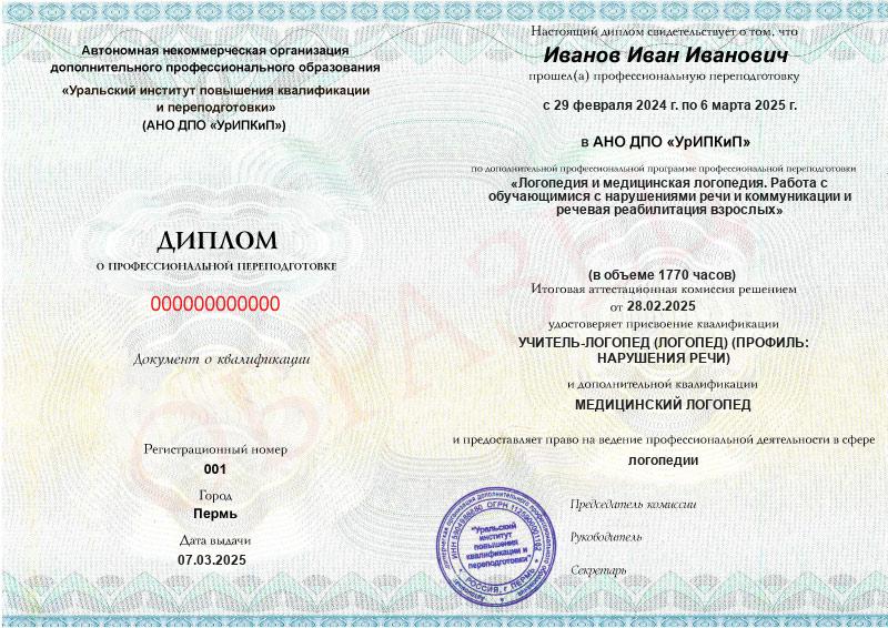 Диплом о профессиональной переподготовке с двумя квалификациями «Учитель-логопед», «Медецинский логопед» (1770ч).Диплом действует на территории всей России и признается государственными и частными организациями
