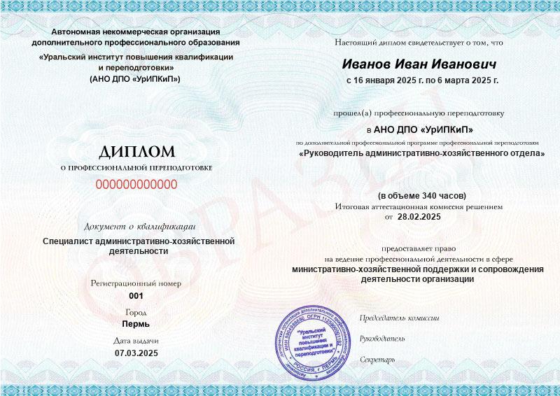- Квалификация: Специалист административно-хозяйственной деятельности